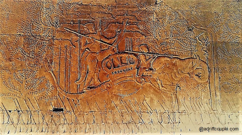 The scene above portrays a splendid triumphal procession from a battle between the Khmers and their enemies. The central figure here is of King Suryavarman II. This relief also shows rows of soldiers who engaged mainly in hand-to-hand combat.