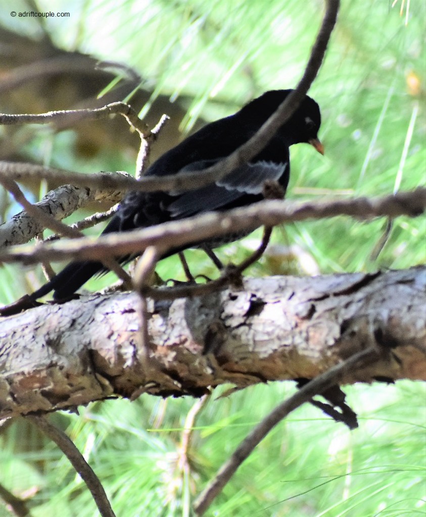 On the way to the dining machaan Ranjana all of sudden spotted this male and managed to capture it with her tiny camera. Since then I always remembered to pick up my Nikon D5600 / 70-300 mm even when we went for meals or a casual stroll. The grey-winged blackbird (Turdus boulboul) is a large forest thrush. The males are black and the flash of silvery plumage gives them a distinguished look. Their orange beak and white eye-rings cut away the camouflage in the forest and undergrowth. The females are brown. Endemic to the Himalayas, in winters these birds migrate to lower altitudes.