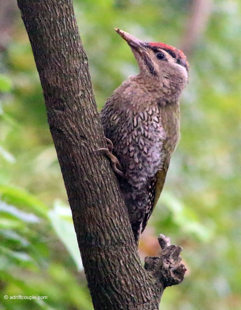 The scaly-bellied woodpecker is large in size with a green back and has a distinctive scaly pattern running from the belly to the tail. The males have a red crown and females have a blackish one. Other features include a large pale bill and a black cheek stripe.