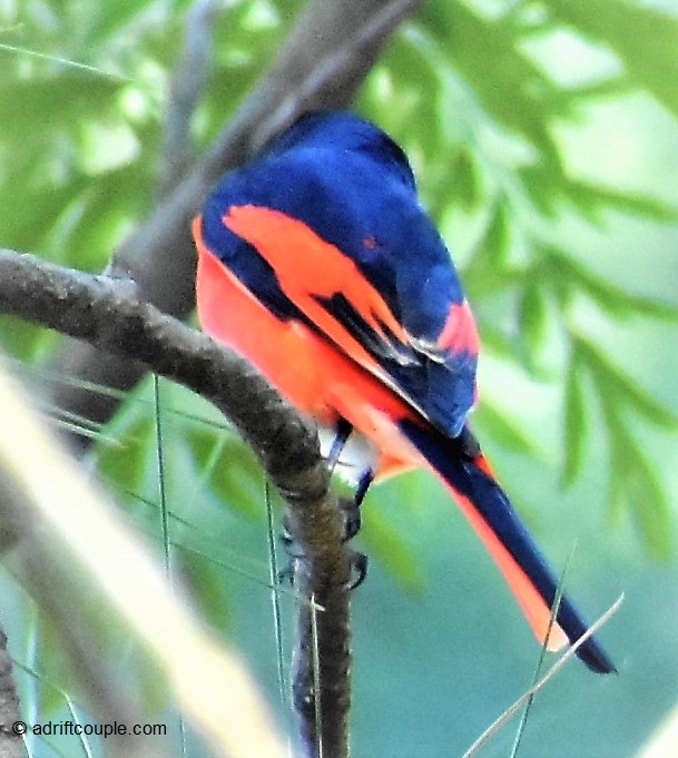 The scarlet minivet is an eight inch passerine bird. It is extremely frisky and forages on the higher branches. This nature and its small size makes it not very easy to photograph. The black upperparts and scarlet underparts lend it a brilliant appearance, always a pleasure to feast one’s eyes on. Though not very clear I did manage to get a colored silhouette of this attractive bird in between multiple sightings.