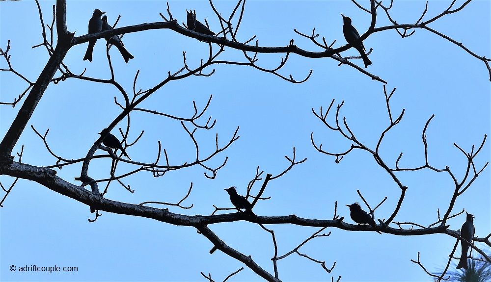 Outlined against the cerulean sky at dusk, the bulbul silhouettes took a strangely surreal beauty on the bare branches.