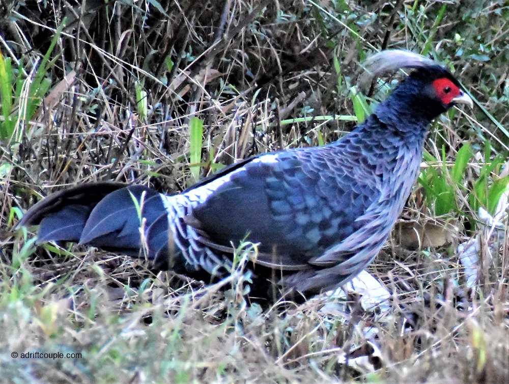 The male Kalij Pheasant is larger than the female and more colorful with bluish plumage and white scales on the lower back. It has a scarlet wattled face with a regal backward pointing finely feathered crest and a bluish white hooked beak. The females are brownish and relatively smaller in size.