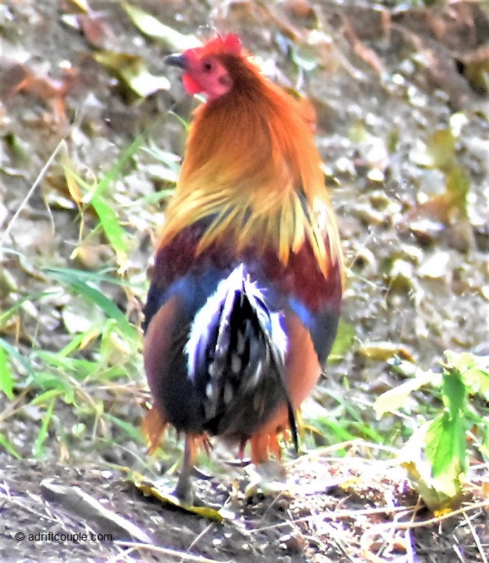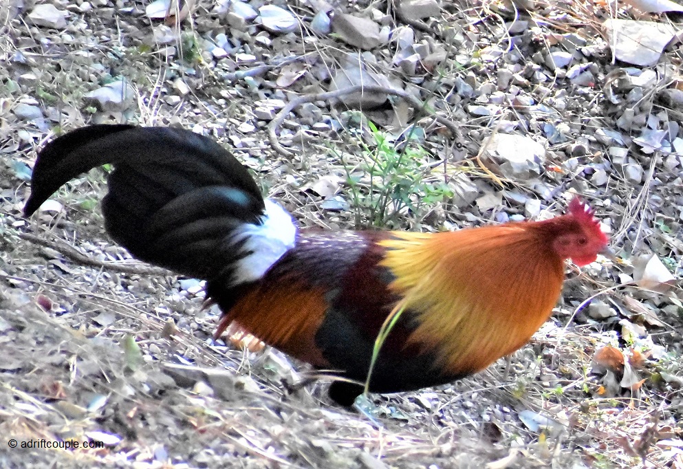 The Wild Red Jungle Fowl is difficult to photograph as it keeps bobbing its head constantly while looking for food. It is a beautiful bird with a rainbow of colours ranging from tomato red to tangerine to teal to aqua to rust to black with long black feathers at the back as long as its main body. I learnt a couple of interesting facts about this bird. One that the chicken was domesticated from the red jungle fowl about 8000 years ago. The second that wattles and comb help it in heat regulation and reddishness indicating good health. Read about it, you may find this grain of knowledge interesting.