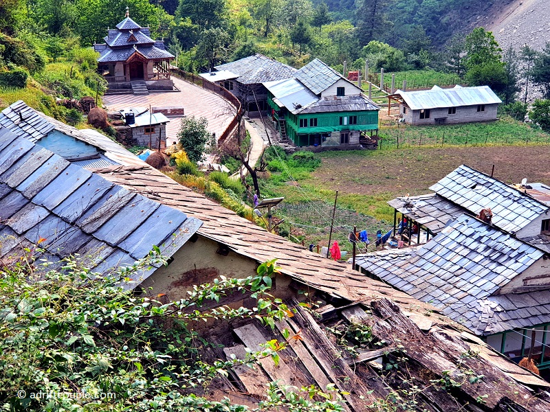 Leaving the road, we drifted down into the jungle and took the forest trail, crossing village houses as we advanced, the birds and the Tirthan River keeping us company.