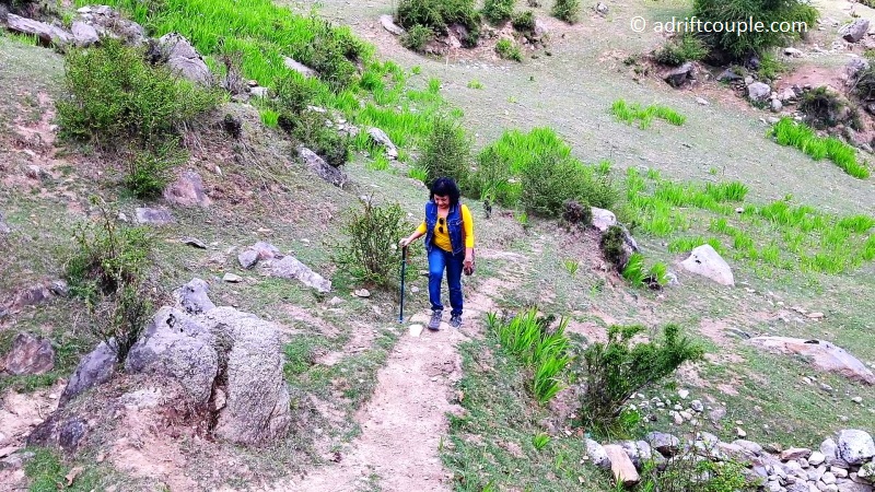The hike to Badasari starts from the tin roof structure (visible in the picture), a road is getting made here but we had to come on foot. You climb uphill and then through the terraced fields and on this cemented path which leads to Jamala Village and then to the Barasari meadow.